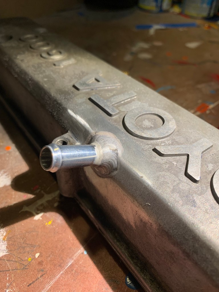 From all that rain from the halfway weekend, i found my cylinder 4 plug was starting to corrode. As I run the twin oil cap cam covers to be able to have two breathers, im unable to run a valley cover as they only have the threads on the one side. Instead of buying another pair of covers to only need one, i decided to just get a spare non cap cover and get my man Benny to weld on a breather !